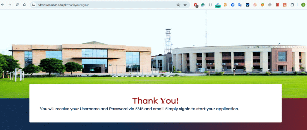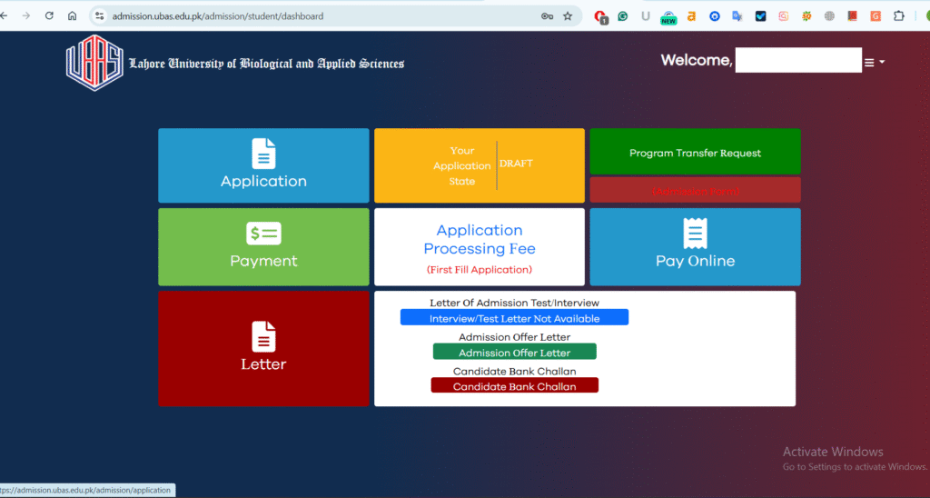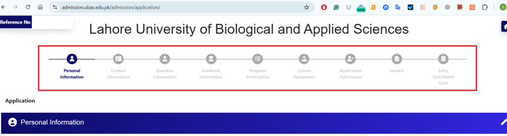 Once you click on Apply Online, it will take you to the online admission page at Lahore-UBAS. From there, initiate your application for UBAS admissions, and in the following, you will see a sample application for Pharm-D for a step-by-step process.