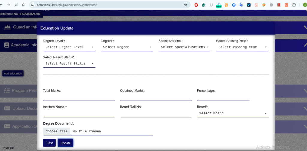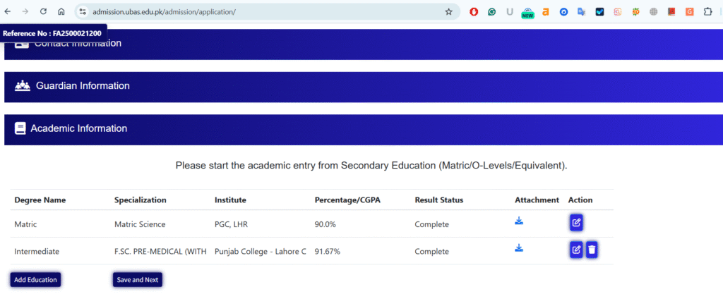 Add your academic record in this section. In this, you will choose from the degree levels available in the drop-down menu with options. Add your academic details from Matric (Secondary School Certificate)  to the latest academic degree, based on which you are applying to UBAS admissions for the next. Degree images are also needed to proceed.