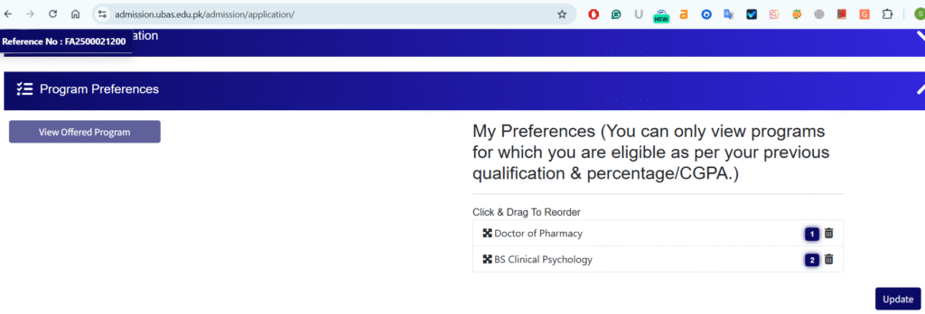 This is one of the most important steps for a candidate applying for UBAS admissions. In this, you will choose your preferred programmes, based on the eligibility criteria from the offered list. You can choose two programmes in this preference and can align them as first and second preference.  Once done, click ‘Úpdate’ and let’s move to the next.