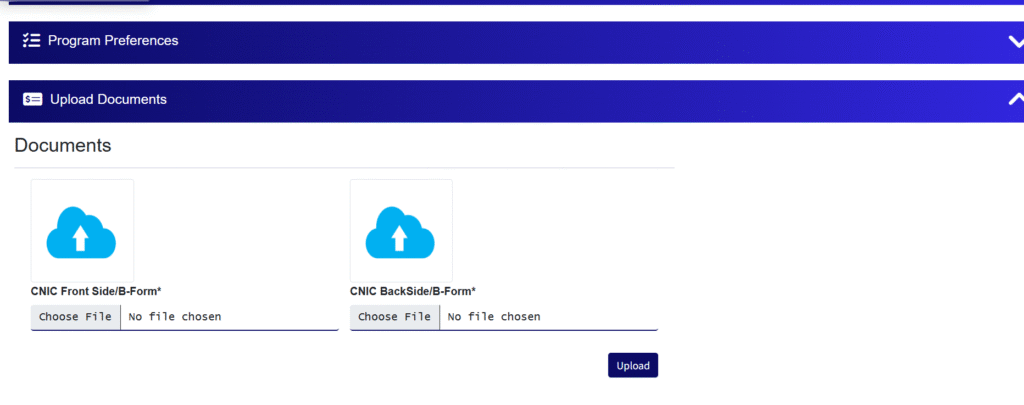 Next on the journey to fill the admission form for Lahore UBAS Admissions, you need to upload your CNIC from the front and back sides separately. The best way to upload a quality image is to place it on a smooth surface and scan it through a document reader. Your mobile camera would be an easy tool to perform this task.