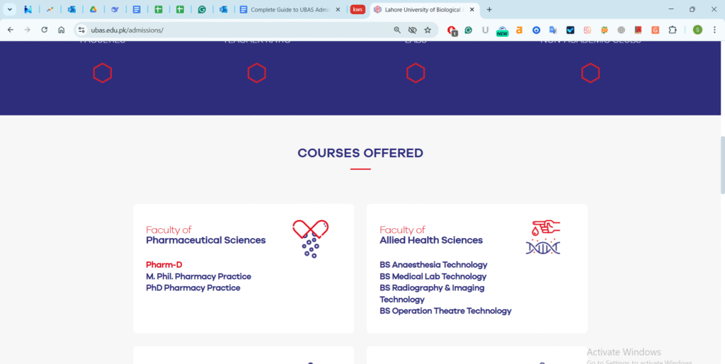 Scroll down the page to see the number of courses offered and other benefits. Scroll down a little more to find the complete details of the offered programmes at Lahore-UBAS. In Fall 2025, a total of 15 programmes are offered and BS and MS/M. Phil programmes are available for the students.