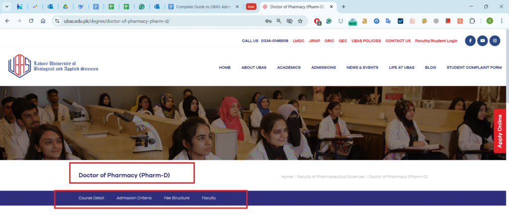 Doctor of Pharmacy or Pharm-D is a comprehensive and full-fledged programme for the pharmacy sciences. In Lahore, students often ask which university is the best for the Pharm-D. Therefore, we have written this article for the FSc premedical students. Lahore-UBAS offers the best Pharm-D programme in Fall 2025. You will get more information in this article. Also, a direct link to apply online.